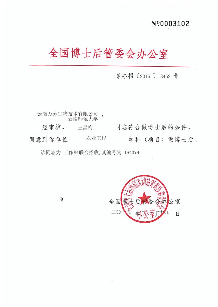 近日,全國(guó)博士后管理委員會(huì)辦公室發(fā)函,同意云南萬(wàn)芳生物技術(shù)有限公司與云南師范大學(xué)聯(lián)合招收的博士后王昌梅進(jìn)站做博士后。